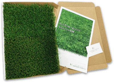 モノガーデンの人工芝「Resort」「Noble」それぞれのサンプルに、人工芝の特徴をご紹介するパンフレットを添えてお送りいたします。